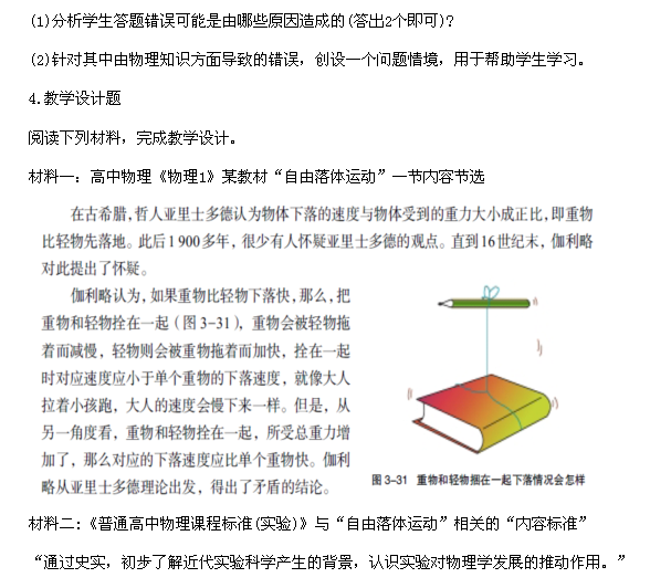 (1)簡要分析材料一內(nèi)容在“自由落體運動”一節(jié)中的作用