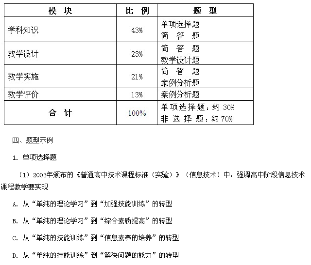 1.信息技術(shù)學(xué)科知識運(yùn)用能力。了解信息技術(shù)發(fā)展的歷史和現(xiàn)狀,把握國內(nèi)外信息技術(shù) 發(fā)展動態(tài);掌握信息技術(shù)學(xué)科基本知識與技能,熟悉信息技術(shù)學(xué)科的特征與應(yīng)用領(lǐng)域;掌握信息技術(shù)學(xué)科教學(xué)的基本理論和方法,并能在信息技術(shù)學(xué)科教學(xué)中靈活運(yùn) 用;理解《普通高中技術(shù)課程標(biāo)準(zhǔn)(實驗)》(信息技術(shù))規(guī)定的課程目標(biāo)、教學(xué)內(nèi)容和實施建議,用以開展學(xué)科教學(xué)和指導(dǎo)學(xué)生實訓(xùn)實踐。