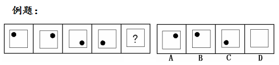 (答案:B。黑點(diǎn)在正方形中順時(shí)針移動(dòng)。在第5個(gè)圖形中,應(yīng)該正好移動(dòng)到左上角。)