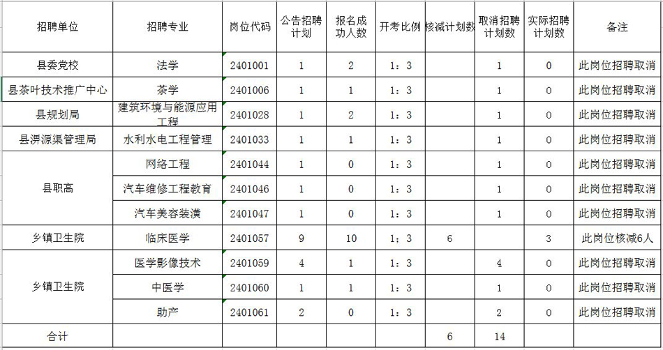 根據(jù)2015年霍山縣部分事業(yè)單位公開招聘工作人員公告精神,下列招聘崗位因報(bào)考人數(shù)達(dá)不到開考比例或無人報(bào)考,按規(guī)定核減和取消招聘計(jì)劃數(shù),現(xiàn)公告如下,請報(bào)考取消招聘崗位的考生于4月30日13:00-17:00改報(bào)其他符合條件的崗位。逾期不改報(bào)的,按退費(fèi)處理。