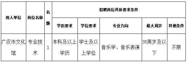 4、報名時,由廣漢市文廣局對考生資格進行初審,市人社局復(fù)審,資格復(fù)審合格的參加考核。資格審查合格考生人數(shù)與崗位名額達到1:1比例的崗位即可開考。