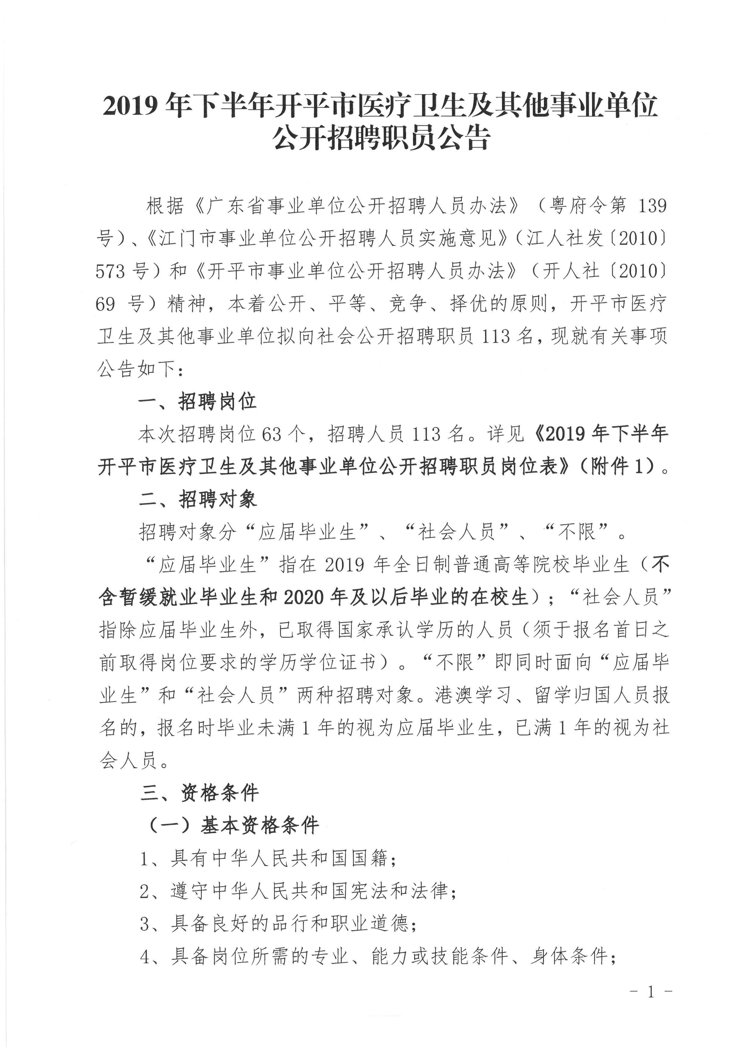 2019年下半年廣東江門開(kāi)平市醫(yī)療衛(wèi)生及其他事業(yè)單位公開(kāi)招聘職員113人公告