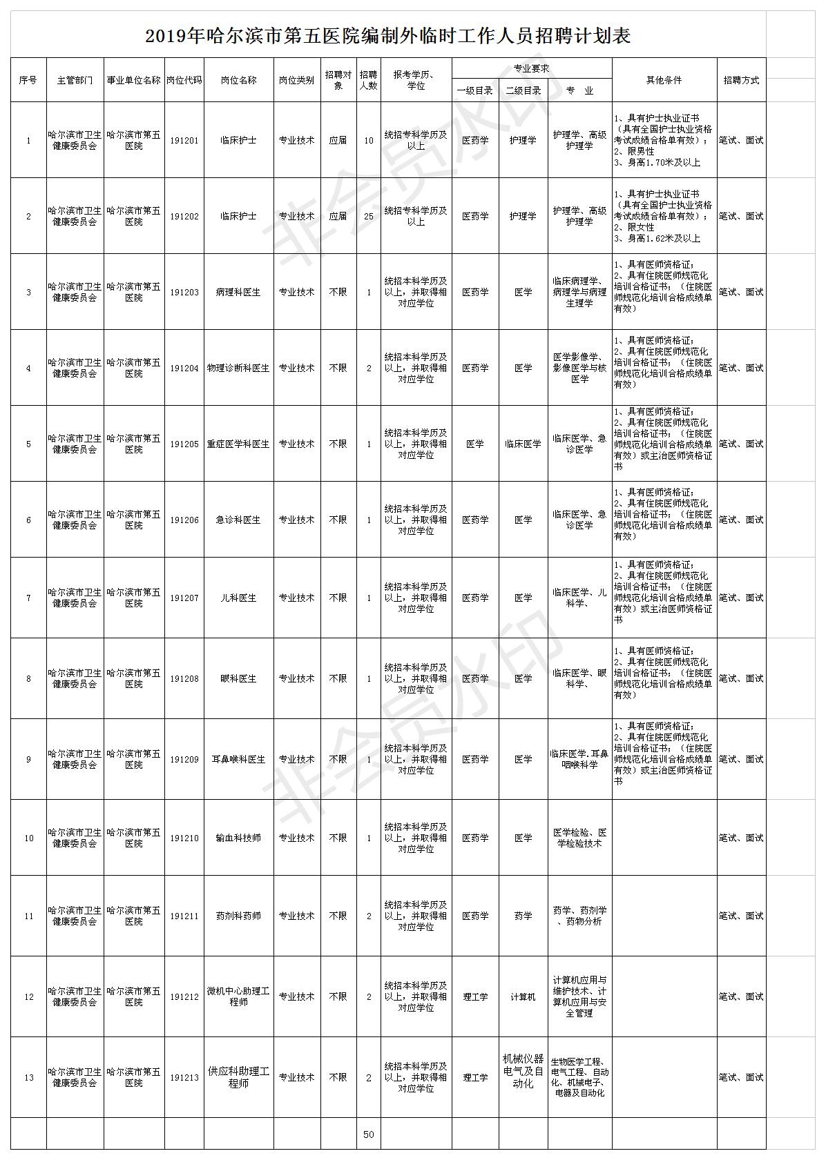 此次招聘編制外臨時工作人員50人。具體招聘崗位、人數(shù)、條件等詳見《哈爾濱市第五醫(yī)院2019年招聘編制外臨時工作人員計劃表》(以下簡稱《招聘計劃表》)。