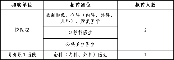 非應(yīng)屆人員應(yīng)為全日制本科及以上學(xué)歷,具有醫(yī)師資格證書,中級及以上專業(yè)技術(shù)職稱。中級職稱者不超過40周歲(1979年12月23日之后出生),高級職稱者不超過45周歲(1974年12月23日之后出生),急缺及特殊人才可適當(dāng)放寬。校醫(yī)院醫(yī)生應(yīng)聘人員需4年以上**醫(yī)院工作經(jīng)歷。同濟(jì)職工醫(yī)院有二級以上綜合性醫(yī)院5年工作經(jīng)驗者優(yōu)先。