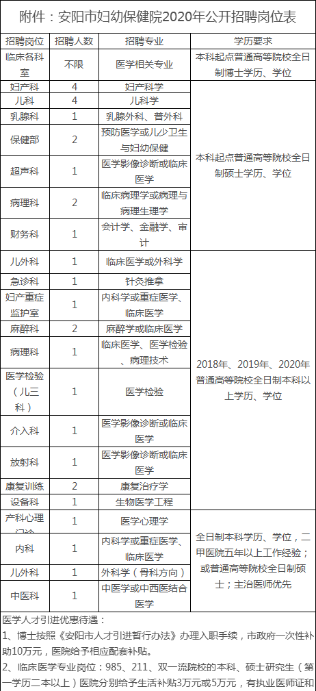 普通高等院校全日制本科以上學(xué)歷畢業(yè)生和專業(yè)技術(shù)人員。招聘崗位、條件及人數(shù)見《安陽市婦幼保健院2020年公開招聘崗位表》(詳見附件)