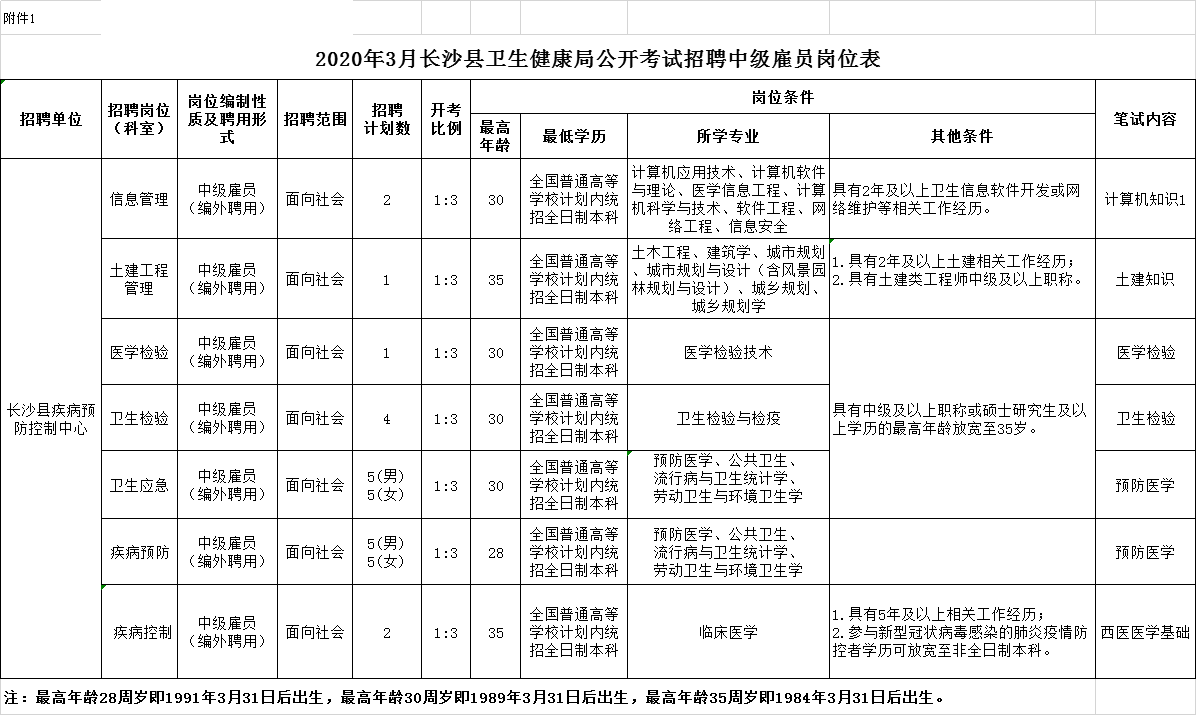 1、2020年3月長沙縣衛(wèi)生健康局公開考試招聘中級雇員崗位表