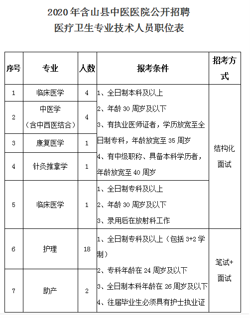 6. 學歷及其他要求詳見《2020年含山縣中醫(yī)醫(yī)院公開招聘醫(yī)療衛(wèi)生專業(yè)技術人員職位表》(附件1)。
