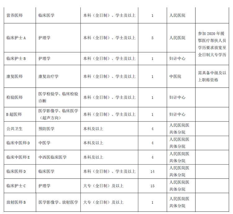 4、執(zhí)業(yè)資格要求:2020年全日制普通高校應(yīng)屆畢業(yè)生暫不作執(zhí)業(yè)資格要求;2019年全日制普通高校醫(yī)學(xué)類(lèi)畢業(yè)生除護(hù)理學(xué)專(zhuān)業(yè)要求具備執(zhí)業(yè)護(hù)士資格證書(shū)外,其他專(zhuān)業(yè)暫不作執(zhí)業(yè)資格要求;2019年前全日制普通高校醫(yī)學(xué)類(lèi)畢業(yè)生須取得相應(yīng)執(zhí)業(yè)資格。其中中醫(yī)院康復(fù)醫(yī)師崗位需具備相應(yīng)中級(jí)或中級(jí)以上職稱(chēng)資格。