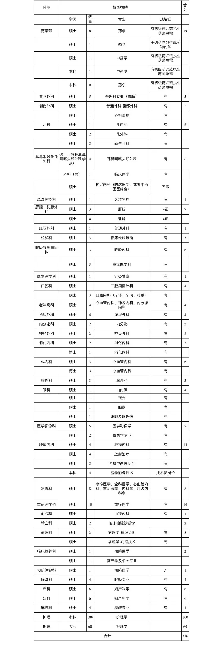 三、應(yīng)屆(2019、2020年)畢業(yè)生。醫(yī)療、醫(yī)技專業(yè)需取得碩士及以上學(xué)歷,取得執(zhí)業(yè)證書、規(guī)培證書;藥學(xué)、檢驗(yàn)、技師專業(yè)需取得碩士及以上學(xué)歷,取得執(zhí)業(yè)證書;護(hù)理學(xué)專業(yè)需取得統(tǒng)招全日制??萍耙陨蠈W(xué)歷(不含3+2專科),要求高中起點(diǎn)(不含職業(yè)高中),取得護(hù)士執(zhí)業(yè)證書;