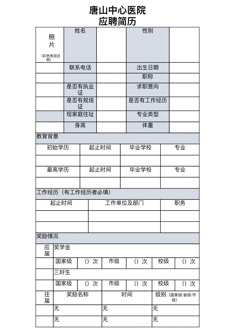 1.應(yīng)聘簡歷:關(guān)注微信公眾號(hào)(唐山中心醫(yī)院),下載應(yīng)聘簡歷模板,按要求填寫。