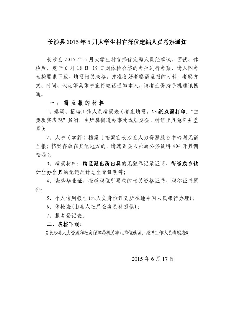 2015年5月湖南長(zhǎng)沙縣大學(xué)生村官擇優(yōu)定編人員考察通知