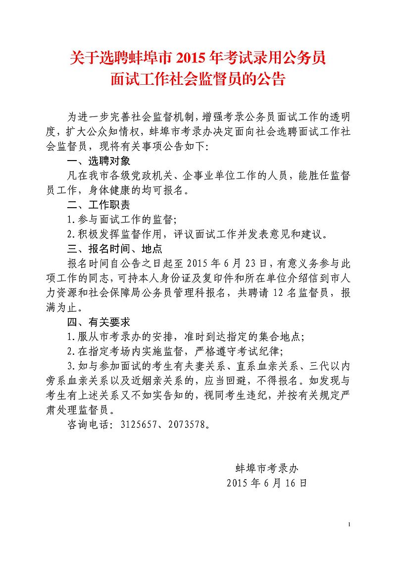 2015年安徽省蚌埠公務(wù)員考試選聘面試工作社會監(jiān)督員的公告