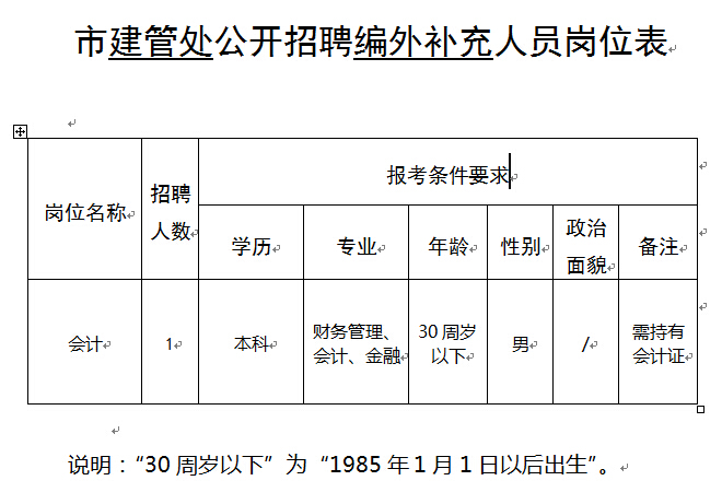 我處于2015年6 月16 日至6 月22 日在蕪湖人才網(wǎng)上發(fā)布了編外補(bǔ)充人員招聘公告,由于會(huì)計(jì)崗位現(xiàn)場(chǎng)報(bào)考人數(shù)不滿足要求,現(xiàn)將招聘條件予以調(diào)整,具體調(diào)整內(nèi)容見《市建管處公開招聘編外補(bǔ)充人員崗位表》。