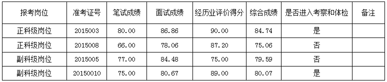根據(jù)《曲靖市紅十字會(huì)2015年公開遴選公務(wù)員實(shí)施方案》的規(guī)定,綜合成績構(gòu)成為筆試成績占40%,面試成績占40%,經(jīng)歷業(yè)績?cè)u(píng)價(jià)占20%,現(xiàn)將曲靖市紅十字會(huì)2015年公開遴選公務(wù)員進(jìn)入經(jīng)歷業(yè)績?cè)u(píng)價(jià)人員的筆試、面試、經(jīng)歷業(yè)績?cè)u(píng)價(jià)、綜合成績及進(jìn)入考察和體檢人員公告如下: