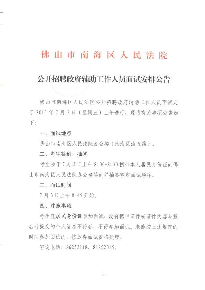 2015廣東佛山南海區(qū)招聘政府輔助人員面試安排公告