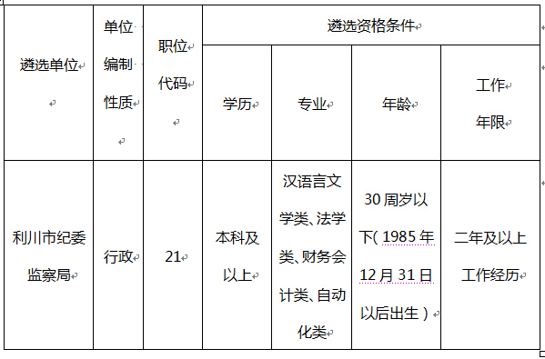 經(jīng)用人單位申請,市公開遴選領(lǐng)導(dǎo)小組研究決定,增設(shè)利川市紀委監(jiān)察局公開遴選工作人員職位,計劃遴選工作人員2名,該職位除報名時間延長至2015年7月10日上午12:00外,其余報考基本要求及報名、考試、考察、公示等程序要求與《利川市2015年市直單位第一次公開遴選公告(第1號)》一致。職位具體條件如下: