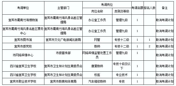 2015年上半年宜賓市市屬事業(yè)單位公開(kāi)考調(diào)工作人員報(bào)名繳費(fèi)工作已結(jié)束,根據(jù)各崗位考生報(bào)名情況,部分未達(dá)考調(diào)公告規(guī)定的最低開(kāi)考比例或無(wú)人報(bào)考的崗位,按考調(diào)公告規(guī)定予以調(diào)減或取消?,F(xiàn)將調(diào)減取消的崗位公告如下: