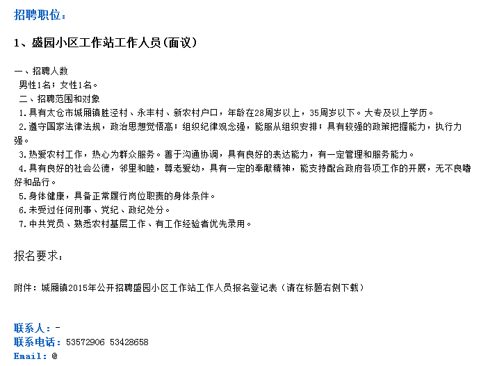 2015江蘇太倉市城廂鎮(zhèn)盛園小區(qū)工作站招聘公告【招2人】