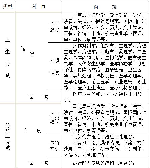 1.考試內(nèi)容與成績構(gòu)成。公招考試分為2類,考生參加報名崗位對應(yīng)的衛(wèi)生考試、非教衛(wèi)考試之一,每類的筆試均含公共筆試、專項筆試2科,試題均為涂機讀卡、答客觀題,進入面試的考1科面試??荚嚳偝煽?公共筆試成績×30%+專項筆試成績×30%+加分×60%+面試成績×40%。該公式不含面試即為筆試總成績??荚噧?nèi)容與成績構(gòu)成見下表。