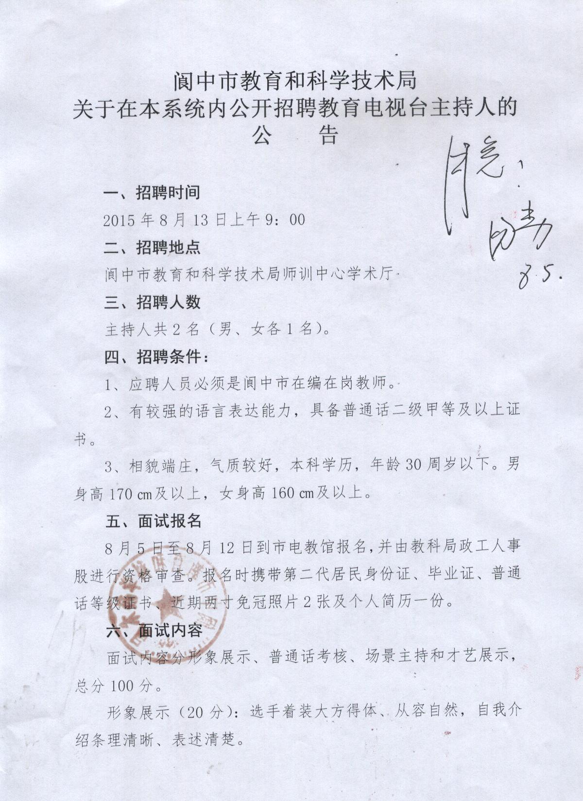 2015四川閬中市教育和科學(xué)技術(shù)局本系統(tǒng)內(nèi)招聘教育電視臺(tái)主持人2人公告