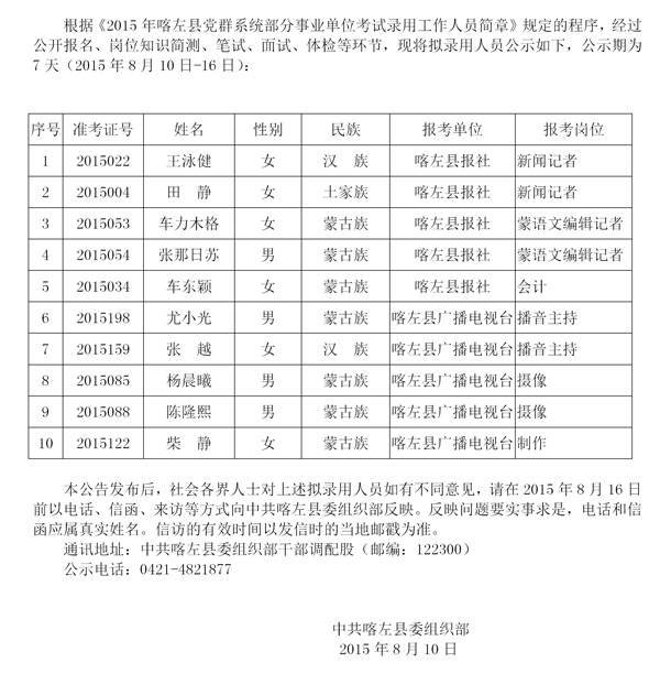 原標(biāo)題:2015年喀左縣黨群系統(tǒng)部分事業(yè)單位考試錄用工作人員公告(六)