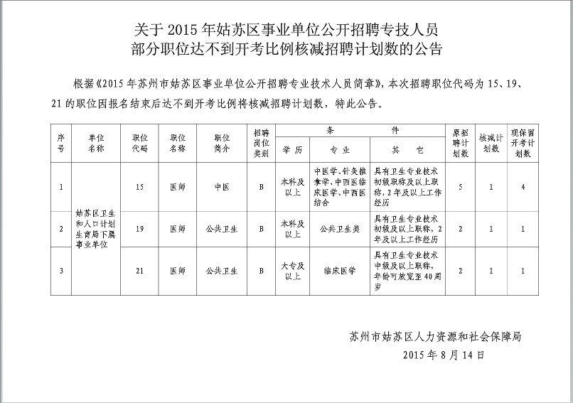 2015江蘇姑蘇區(qū)事業(yè)單位招聘專(zhuān)技人員職位達(dá)不到開(kāi)考比例核減招聘計(jì)劃數(shù)公告