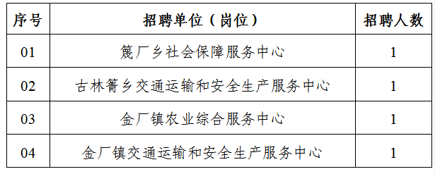 2015年我縣鄉(xiāng)鎮(zhèn)事業(yè)單位面向全省統(tǒng)一選聘、在我縣任滿兩個聘期的大學生村官招聘4名工作人員,具體崗位如下: