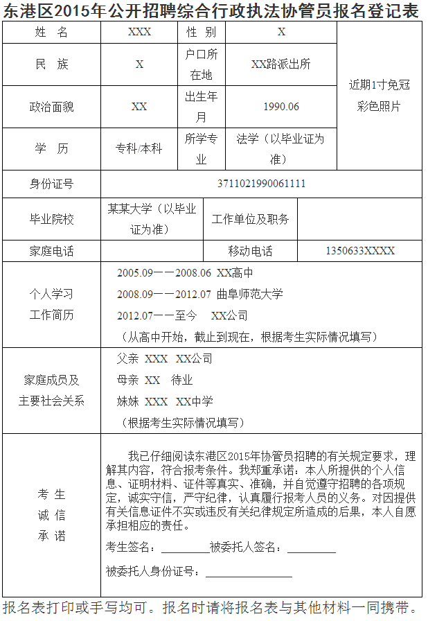 報(bào)名要求:報(bào)名時(shí)攜帶畢業(yè)證、報(bào)到證(未就業(yè)的),身份證及以上所有證件的復(fù)印件(A4紙)、戶口簿(或當(dāng)?shù)嘏沙鏊鶓艏C明)、近期1寸同底免冠彩照3張,已就業(yè)的需用人單位開具單位同意報(bào)考證明加蓋公章,報(bào)名與考試時(shí)使用的身份證必須一致,委托他人報(bào)名者,被委托人應(yīng)持身份證等有效證件。請考生自行打印并填寫招生簡章最下方的《東港區(qū)2015年公開招聘綜合行政執(zhí)法協(xié)管員報(bào)名登記表》,經(jīng)審查合格的人員,繳納考務(wù)費(fèi)40元。