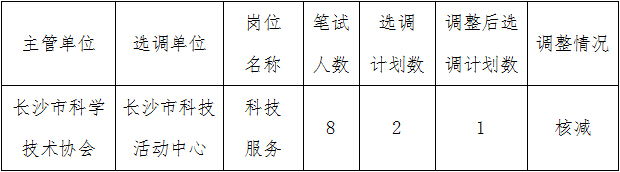 2015年長沙市科技活動中心公開選調工作人員經報名、資格初審等程序,共有1個崗位未達到《選調公告》規(guī)定的開考比例,根據(jù)《選調公告》的相關規(guī)定,核減科技服務崗位選調計劃1名,具體情況下:
