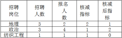 根據(jù)《天臺縣教育局 天臺縣人力資源和社會局 關(guān)于天臺縣教育局校園招聘2016屆高校畢業(yè)生的公告》規(guī)定,“報名人數(shù)與錄用崗位須達(dá)到 2∶1及以上的比例方可開考,未達(dá)比例的相應(yīng)核減錄用指標(biāo)或不開考。”經(jīng)研究,決定對以下錄用崗位指標(biāo)進(jìn)行核減。