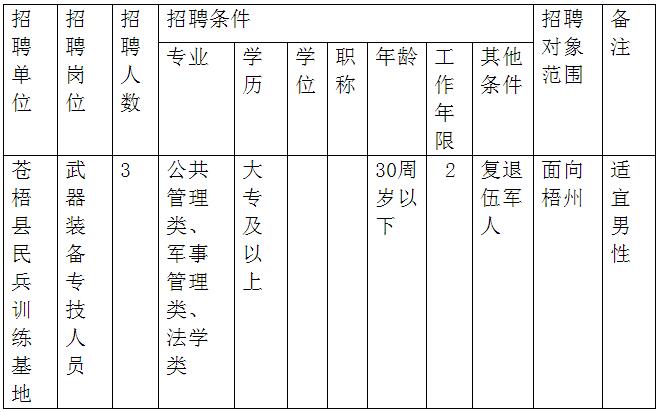 蒼梧縣民兵武裝訓(xùn)練基地招聘工作人員3名,具體招聘崗位、人數(shù)和條件如下: