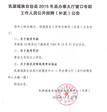 2015廣東乳源縣辦事大廳窗口專職人員招聘補充公告
