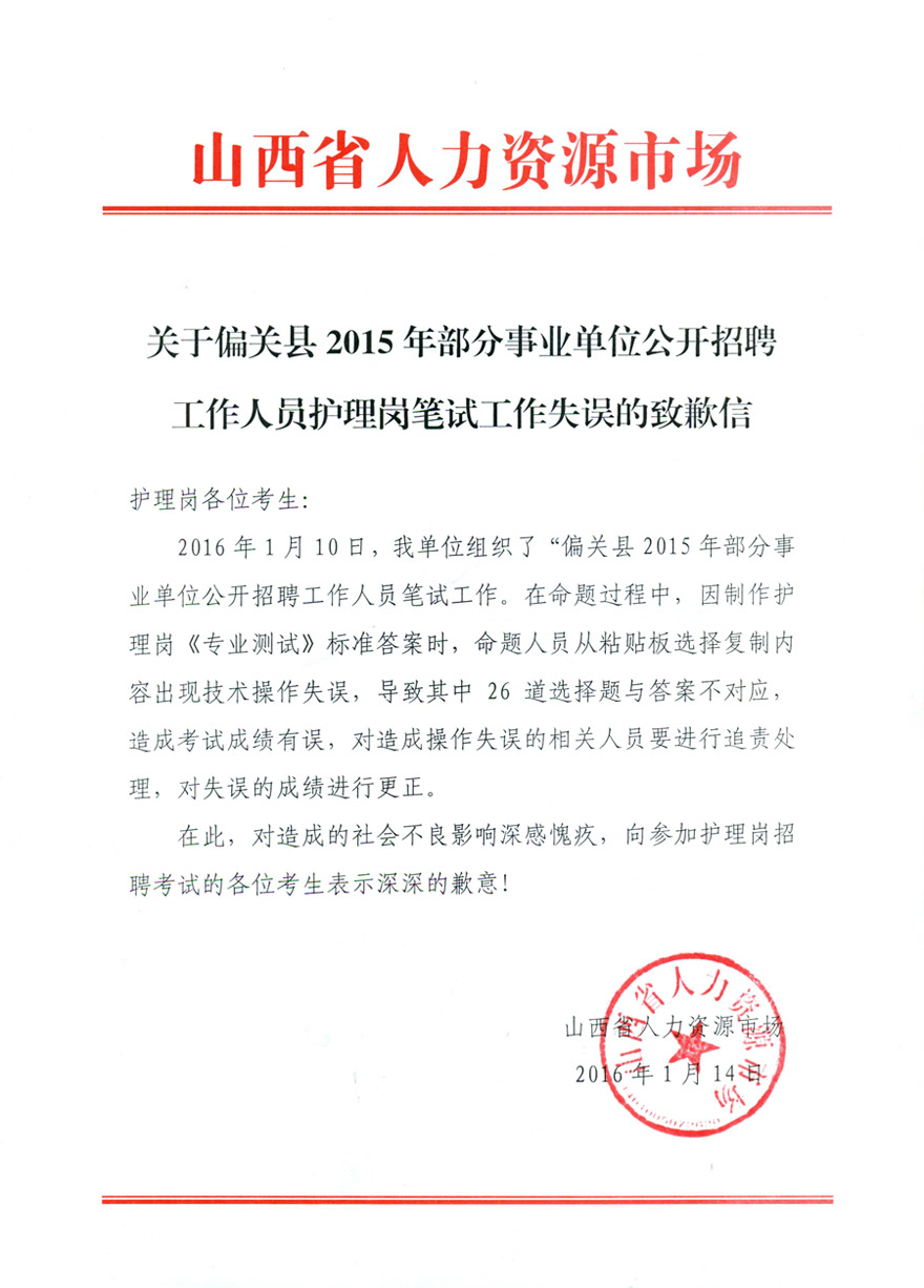 2015山西偏關(guān)縣事業(yè)單位招聘護理崗位筆試工作失誤的致歉信