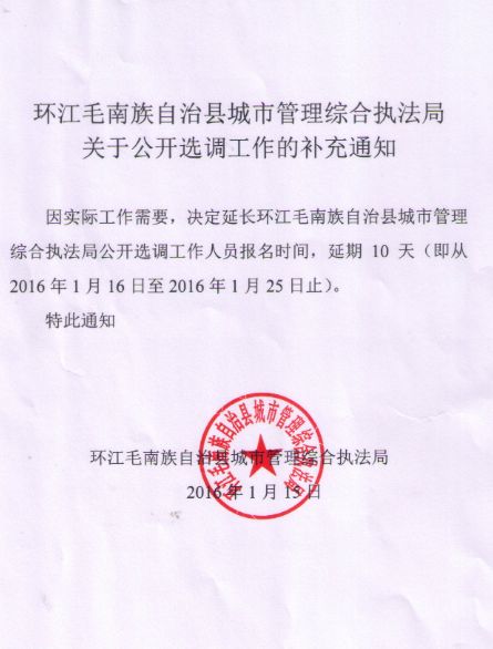 2016廣西環(huán)江縣城市管理綜合執(zhí)法局選調(diào)補(bǔ)充通知