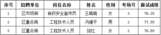 根據(jù)《瑤海區(qū)公開(kāi)招聘工作人員公告》規(guī)定,因聘用人員未能按時(shí)到崗,視為自動(dòng)放棄聘用資格,從該崗位面試人選中按面試成績(jī)從到低分等額有效遞補(bǔ)?,F(xiàn)將遞補(bǔ)人員名單公告如下: