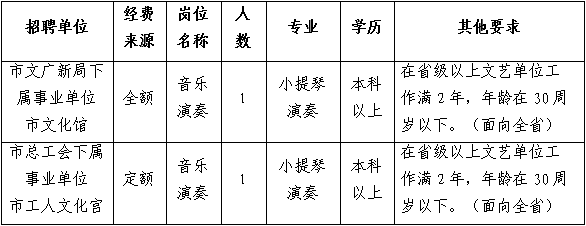 根據(jù)市文廣新局、市總工會申報(bào)需求,經(jīng)審核,面向社會公開招聘音樂演奏(小提琴演奏)人員共計(jì)2人(具體計(jì)劃詳見下表)。