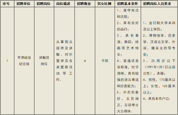 原標(biāo)題:天津市文廣局事業(yè)單位“平津戰(zhàn)役紀(jì)念館”社會(huì)化用工招聘公告