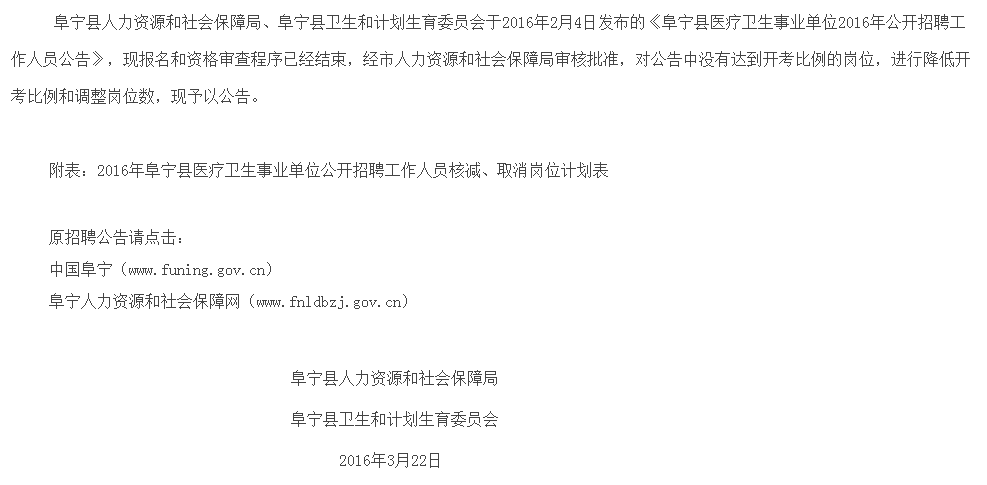 原標(biāo)題:關(guān)于2016年阜寧縣醫(yī)療衛(wèi)生事業(yè)單位公開招聘工作人員降低開考比例和調(diào)整崗位數(shù)的補(bǔ)充公告