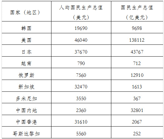 2007年部分國(guó)家(地區(qū))國(guó)民生產(chǎn)總值