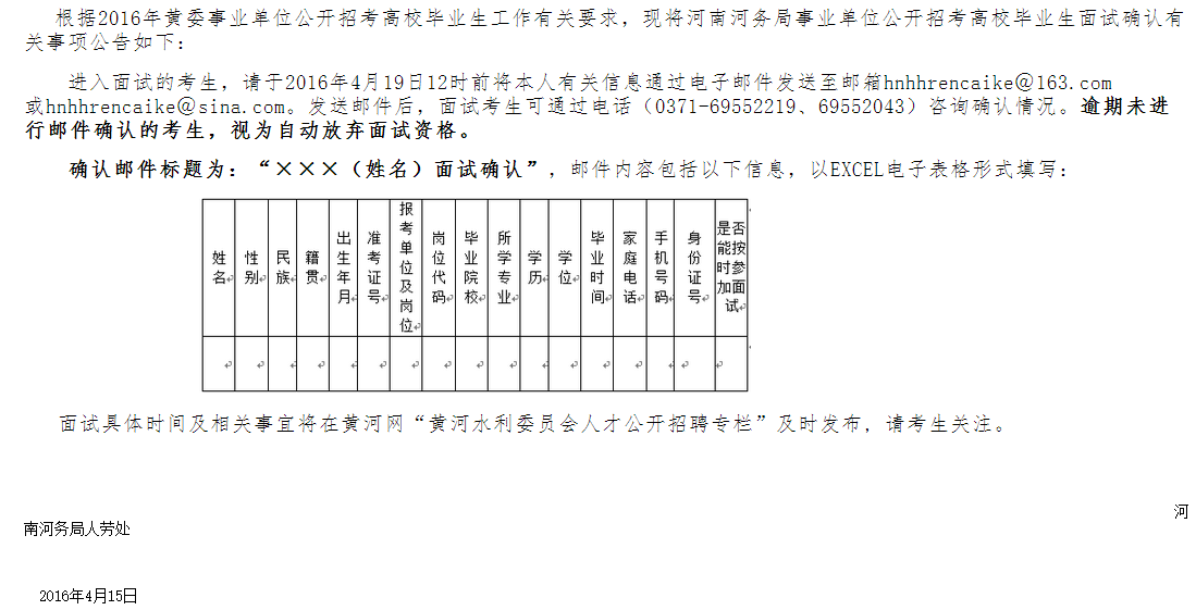 原標(biāo)題:2016年河南河務(wù)局事業(yè)單位公開招考高校畢業(yè)生面試確認(rèn)公告