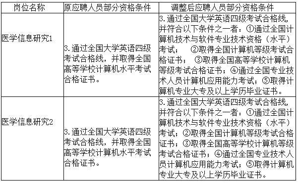 我所于2016年5月11-5月20日在廣西人才網(wǎng)、廣西衛(wèi)生和計(jì)劃生育委員會(huì)官方網(wǎng)站及廣西醫(yī)學(xué)信息網(wǎng)發(fā)布了《廣西壯族自治區(qū)醫(yī)學(xué)科學(xué)信息研究所 2016年公開招聘人員公告》,因報(bào)名人數(shù)未達(dá)到自治區(qū)政府人社部門文件規(guī)定的比例及我所公告中的要求,經(jīng)自治區(qū)人力資源和社會(huì)廳批準(zhǔn),現(xiàn)將崗位的報(bào)名條件進(jìn)行適當(dāng)調(diào)整,報(bào)名時(shí)間延長至2016年6月8日。請(qǐng)廣大考生抓緊時(shí)間報(bào)名,報(bào)名的方法和要求按原公告不變。具體崗位部分報(bào)名條件調(diào)整見下表。
