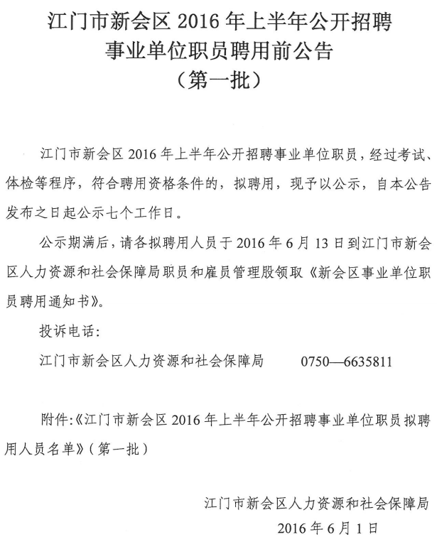 原標(biāo)題:江門市新會(huì)區(qū)2016年上半年公開(kāi)招聘事業(yè)單位職員聘前公告(第一批)