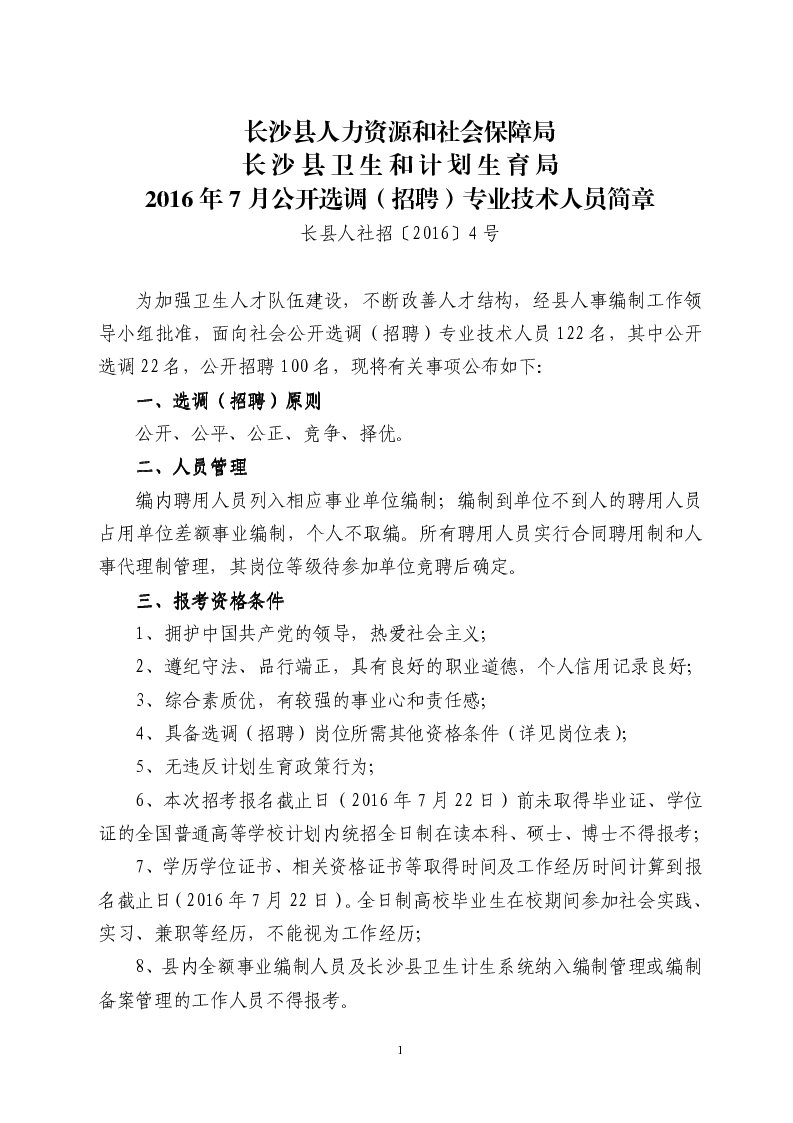 2016湖南長(zhǎng)沙縣人力資源和社會(huì)局選調(diào)(招聘)專業(yè)技術(shù)人員122人公告