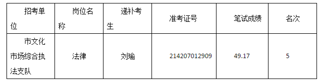 鄂州市文體新廣系統(tǒng)2016年事業(yè)單位公開招聘資格復(fù)審,因市文化市場(chǎng)綜合執(zhí)法支隊(duì)法律崗位第2名考生劉家麟放棄資格復(fù)審,根據(jù)《鄂州市事業(yè)單位2016年度公開招聘工作人員公告》有關(guān)規(guī)定,在報(bào)考同一崗位考生中按照筆試成績從到低分依次遞補(bǔ)的原則,遞補(bǔ)以下考生為資格復(fù)審人選: