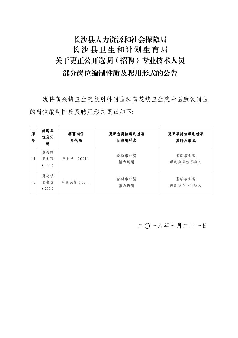2016湖南長沙縣選調(diào)(招聘)專業(yè)技術(shù)人員崗位編制性質(zhì)及聘用形式更正公告