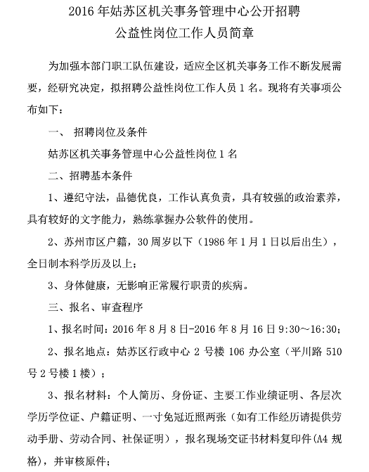 原標(biāo)題:2016年姑蘇區(qū)機(jī)關(guān)事務(wù)管理中心公開招聘公益性崗位工作人員簡章