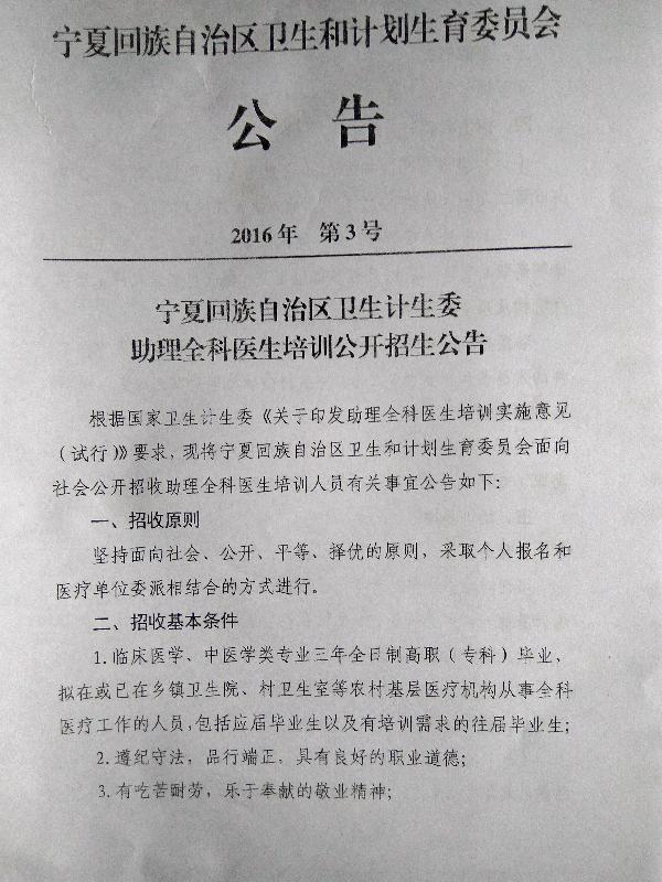 2016寧夏回族自治區(qū)衛(wèi)生計(jì)生委助理全科醫(yī)生培訓(xùn)招生公告【招50人】