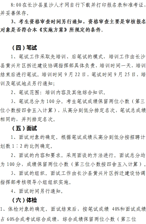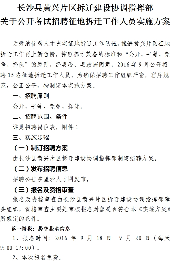 原標(biāo)題:長(zhǎng)沙縣黃興片區(qū)拆遷建設(shè)協(xié)調(diào)指揮部關(guān)于公開考試招聘征地拆遷工作人員實(shí)施方案