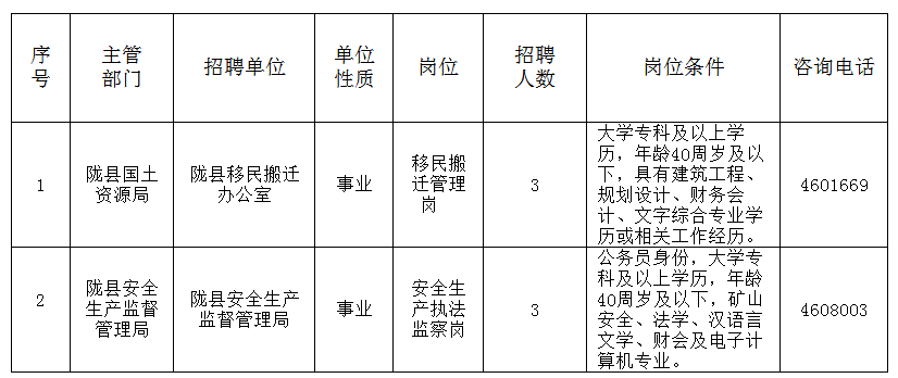 二、選調(diào)職位:詳見下表《2016年隴縣國土資源局、安全生產(chǎn)監(jiān)督管理局公開選調(diào)工作人員計(jì)劃表》