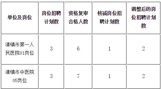 清鎮(zhèn)市2016年衛(wèi)生系統(tǒng)公開(kāi)招聘事業(yè)單位工作人員資格復(fù)審工作已結(jié)束。按照《清鎮(zhèn)市2016年衛(wèi)生系統(tǒng)公開(kāi)招聘事業(yè)單位工作人員簡(jiǎn)章》中“通過(guò)資格復(fù)審人數(shù)與崗位招聘計(jì)劃數(shù)之比達(dá)不到3?1的,減少該崗位招聘計(jì)劃數(shù)(例:某崗位招聘計(jì)劃數(shù)為2,通過(guò)資格復(fù)審人數(shù)為4或5,則該崗位招聘計(jì)劃數(shù)減少為1,依此類(lèi)推)”的規(guī)定,現(xiàn)將清鎮(zhèn)市第一人民醫(yī)院01崗位、清鎮(zhèn)市中醫(yī)院05崗位招聘計(jì)劃數(shù)調(diào)整如下: